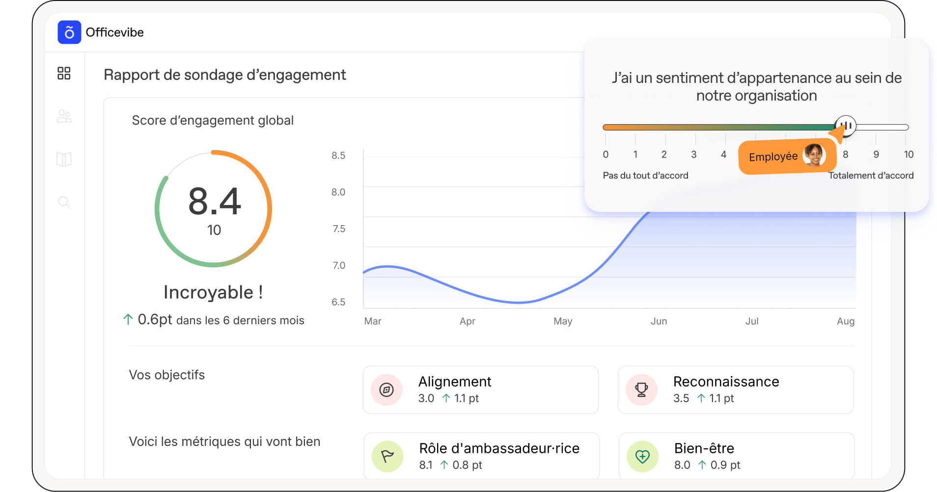 Workleap Officevibe est une solution de gestion de l’engagement des employés conçue pour aider les entreprises à renforcer la satisfaction, la rétention et la performance des équipes. Elle offre des sondages d’engagement personnalisables, des outils de rétroaction anonyme et des fonctionnalités de reconnaissance entre collègues, permettant de recueillir des insights précieux et de stimuler l’engagement. Grâce à des sondages éclairs automatisés et des rapports détaillés, les gestionnaires peuvent suivre l’évolution de l’engagement en temps réel et prendre des décisions éclairées pour améliorer l’expérience employé.